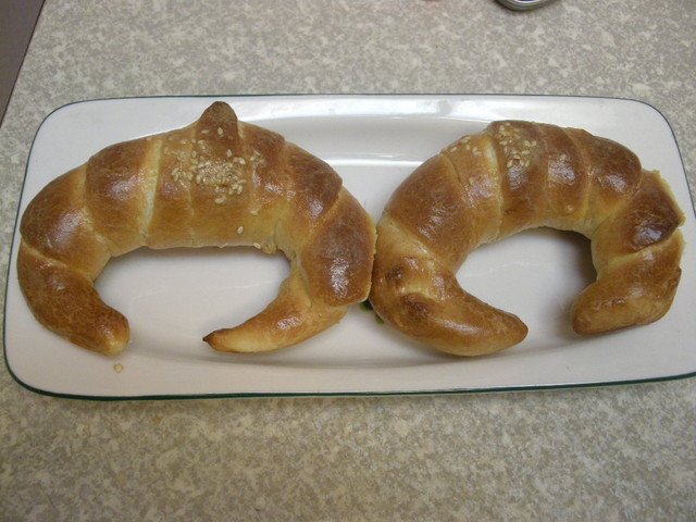 14.將2端往內捲成為牛角型,收口朝下,間隔整齊排入烤盤中