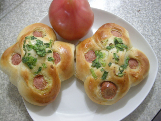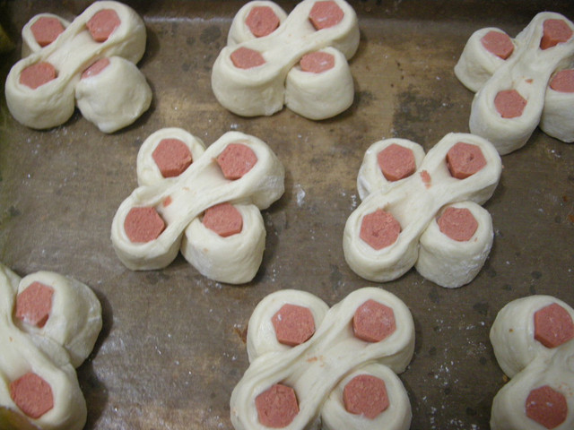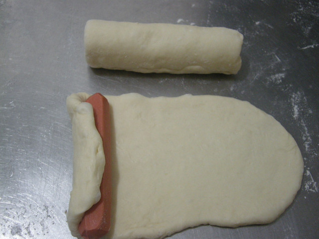 麵皮上放上熱狗,將熱狗捲起,收口處捏緊