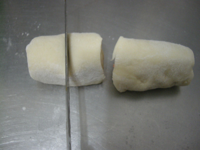 然後在2個麵團中間再切一刀,但是不要切斷(有部份麵團連著)