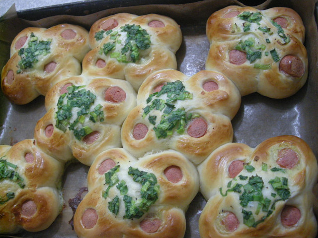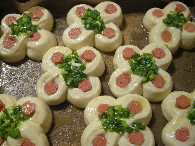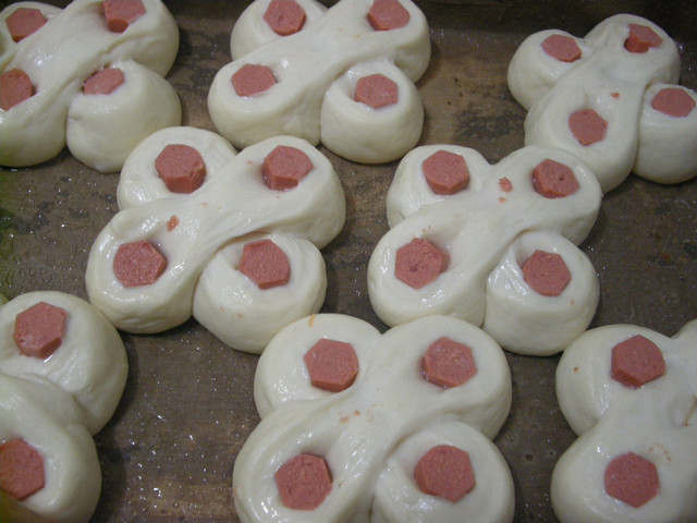 切開的麵團交錯放置成十字狀態.完成的麵團間隔整齊放入烤盤中,噴些水放烤箱中再發酵45-50分鐘至2倍大